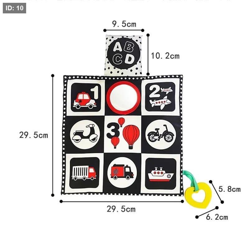 لوحة قماشية ناعمة بتصميم ذكي يجمع بين الألوان عالية التباين (أسود، أبيض، أحمر) لتحفيز نظر الطفل وتركيزه البصري.