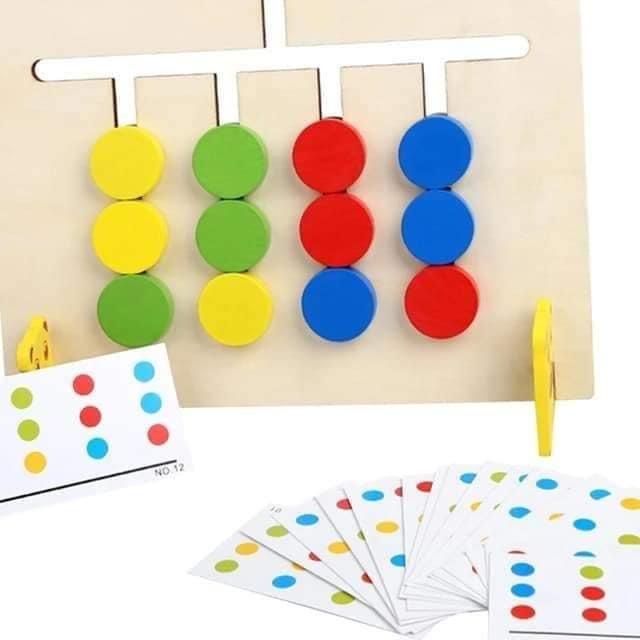 لعبة خشبية تفاعلية تساعد الطفل على تطوير مهارات التركيز، المطابقة، والتفكير المنطقي من خلال ترتيب الأقراص حسب نمط البطاقات.