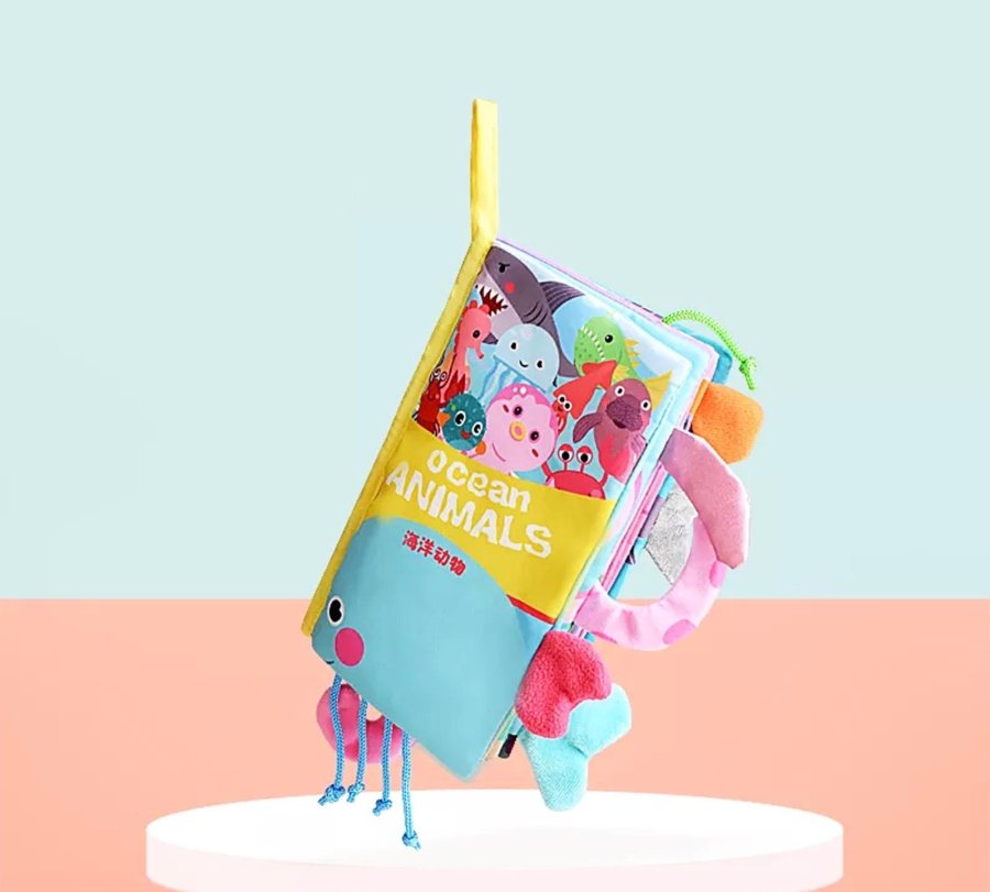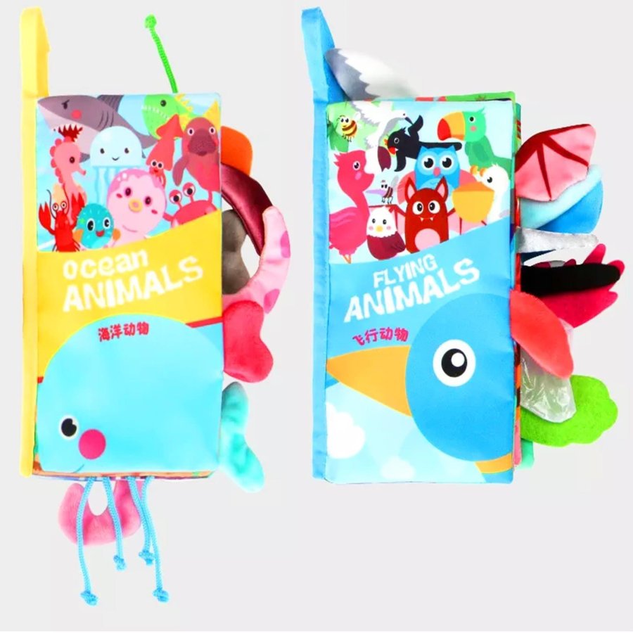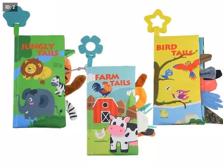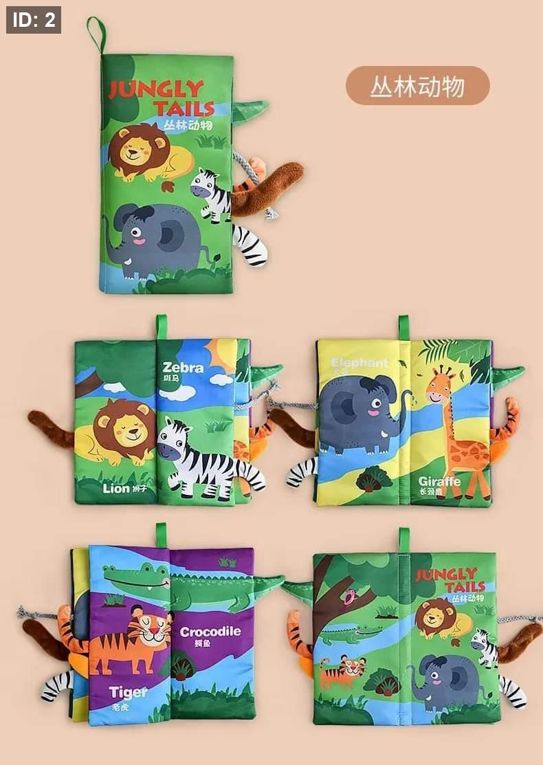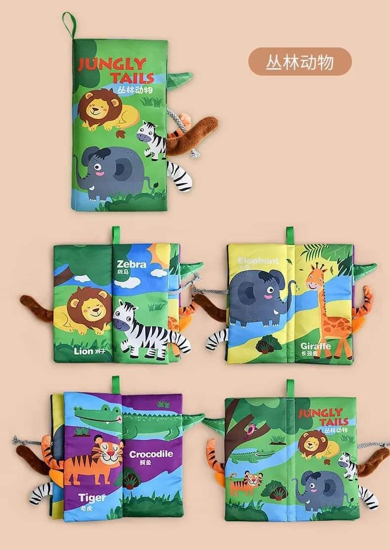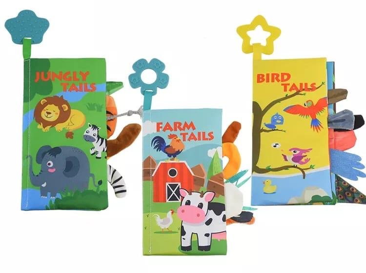 كتب قماشية ناعمة وآمنة تحتوي على ألوان زاهية، ذيول وأجزاء ملموسة، وأصوات تصدر عند اللمس لتجعل التجربة أكثر حيوية وتشويقًا 👶✨