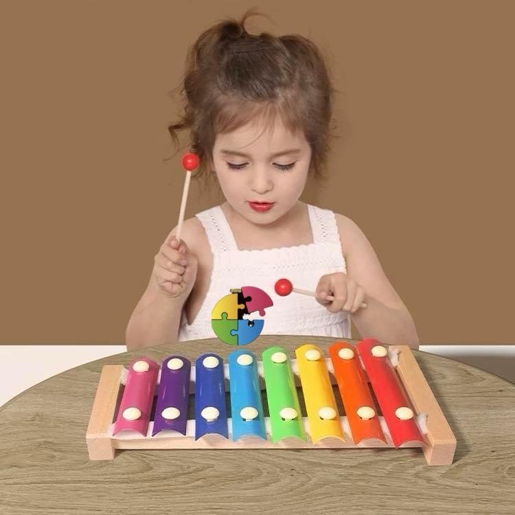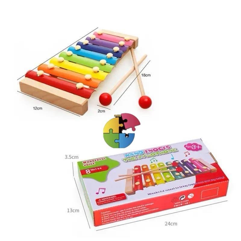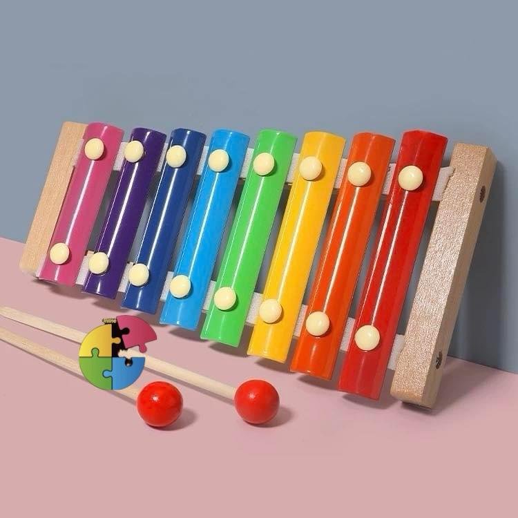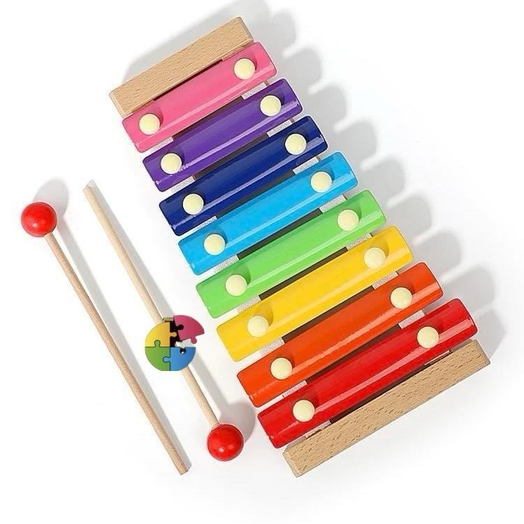 لعبة موسيقية خشبية مصممة للأطفال من عمر 3 سنوات فما فوق، تجمع بين الاكتشاف الصوتي والتفاعل الحسي. تتكون من قاعدة خشبية تحمل ثمانية قضبان معدنية ملونة، كل منها يصدر نغمة مختلفة عند الطرق عليه، مما يتيح للطفل تجربة العزف والتعبير الإيقاعي. تأتي اللعبة مع مطرقتين خشبيتين ذات رؤوس مطاطية حمراء، مصممتين خصيصًا لتكون آمنة وسهلة الاستخدام لليدين الصغيرتين.