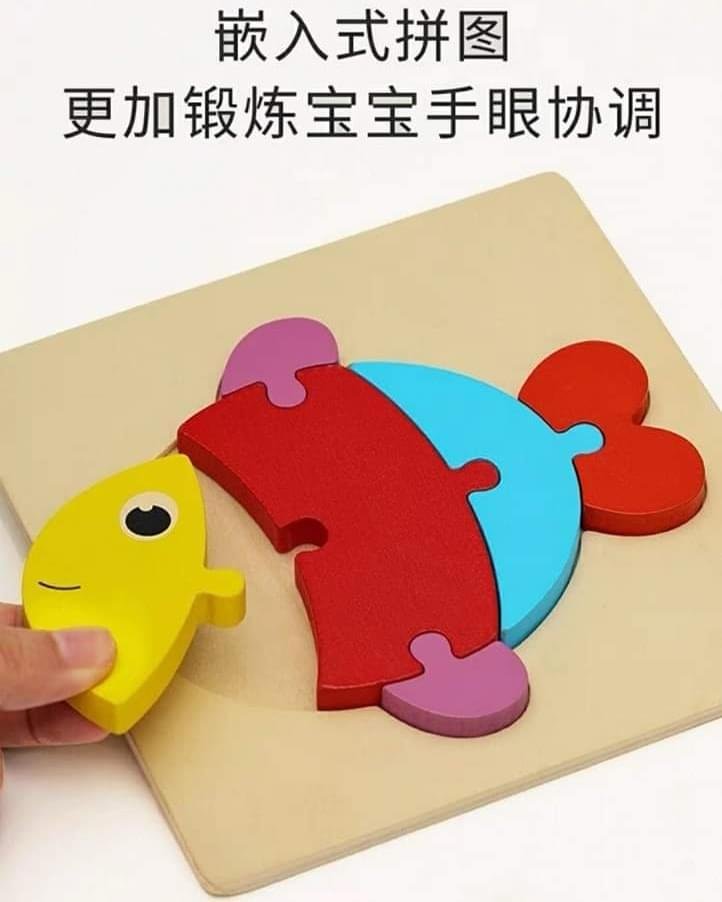 مجموعة من ألواح البازل الخشبية الملونة، كل منها يحتوي على صورة كرتونية مبهجة لحيوان أو مركبة، مقسّمة إلى قطع متشابكة تساعد الطفل على التركيب والتعرف على الأشكال. تشمل التصاميم ضفدع بعيون كبيرة، فيل بألوان زاهية، ومركبة حمراء، مما يضفي جوًا من المرح والتنوع