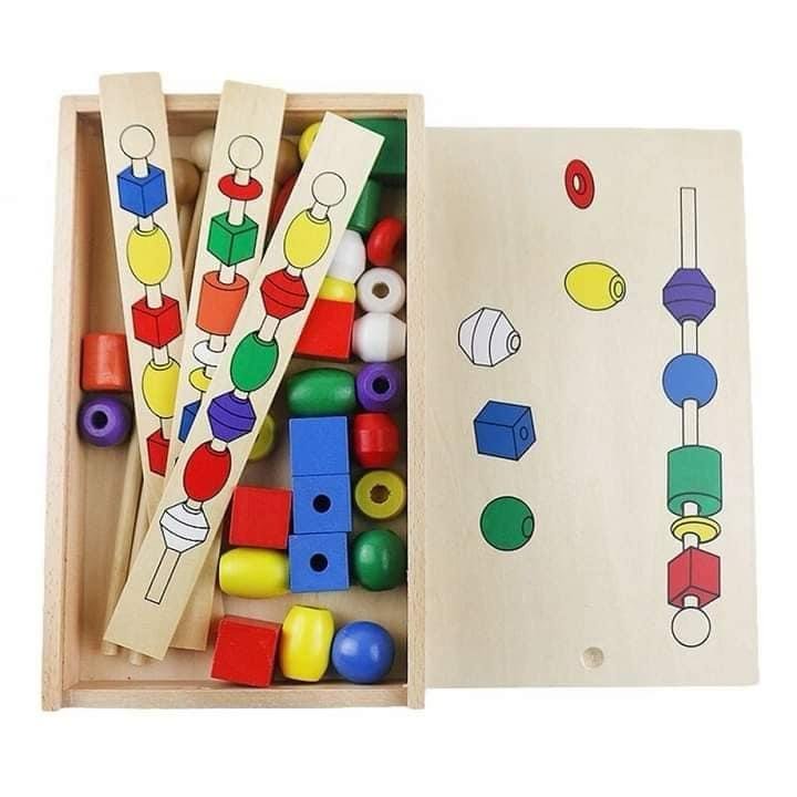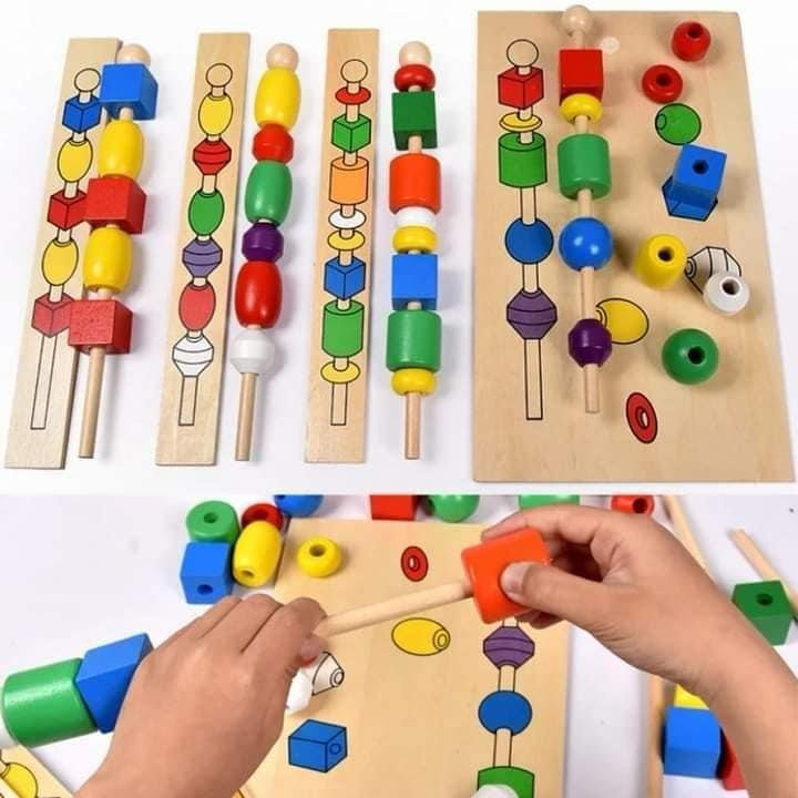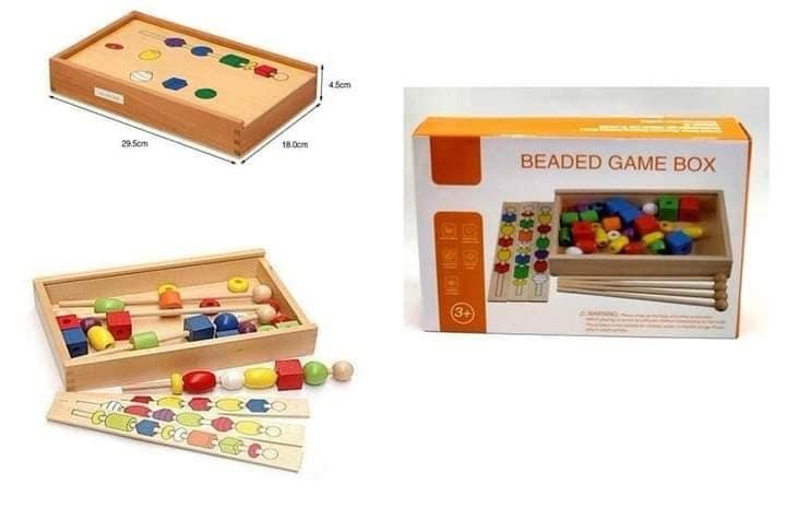 مجموعة تعليمية خشبية تحتوي على خرزات ملونة بأشكال وأحجام متنوعة، بطاقات أنماط مصورة، وعصي خشبية للتركيب. يقوم الطفل بترتيب الخرزات على العصي حسب النمط الموجود في البطاقة، مما يعزز مهاراته في المطابقة، العد، والتنسيق بين اليد والعين. تأتي المجموعة داخل صندوق خشبي أنيق بحجم 25.5 × 18 × 4.5 سم، يسهل تخزينه وحمله.