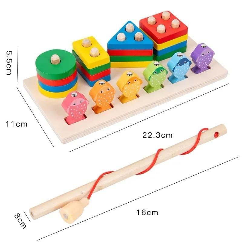 لعبة خشبية تفاعلية مناسبة لعمر 3 سنوات فما فوق، تُشجّع الطفل على تنمية المهارات الحركية الدقيقة من خلال تكديس الأشكال الهندسية على الأعمدة، وصيد الأسماك المغناطيسية باستخدام السنارة. كل قطعة ملوّنة ومصممة لتُحفّز التنسيق بين اليد والعين، التعرّف على الأشكال، واللعب التخيّلي.