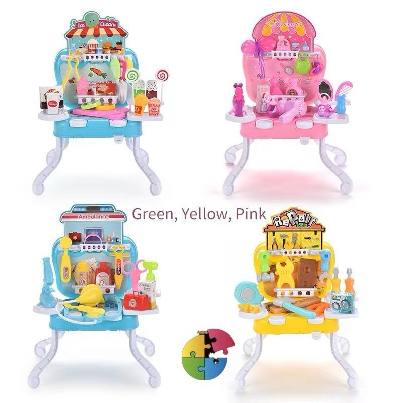 كل طاولة تمثل مهنة مختلفة، مصممة لتشجيع اللعب التخيّلي وتنمية المهارات الاجتماعية والمعرفية لدى الأطفال. كل طاولة تحتوي على أدوات مصغّرة وملحقات مناسبة للمهنة، مما يتيح للطفل أن يعيش تجربة واقعية مصغّرة مليئة بالمرح والتعلّم.