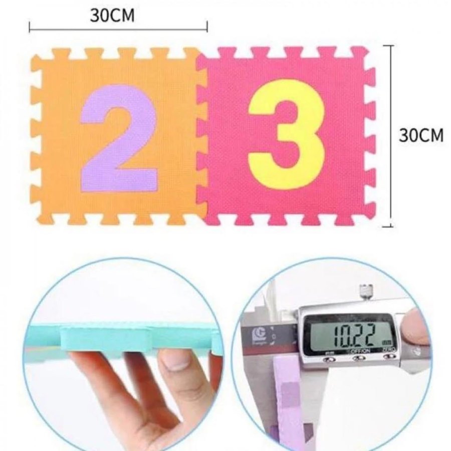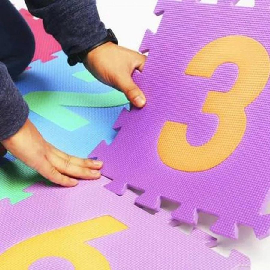 سجادة تعليمية مكوّنة من قطع متشابكة، كل قطعة تحمل رقمًا كبيرًا بلون متباين، مما يسهل على الطفل التعرف عليه بصريًا ولمسيًا.