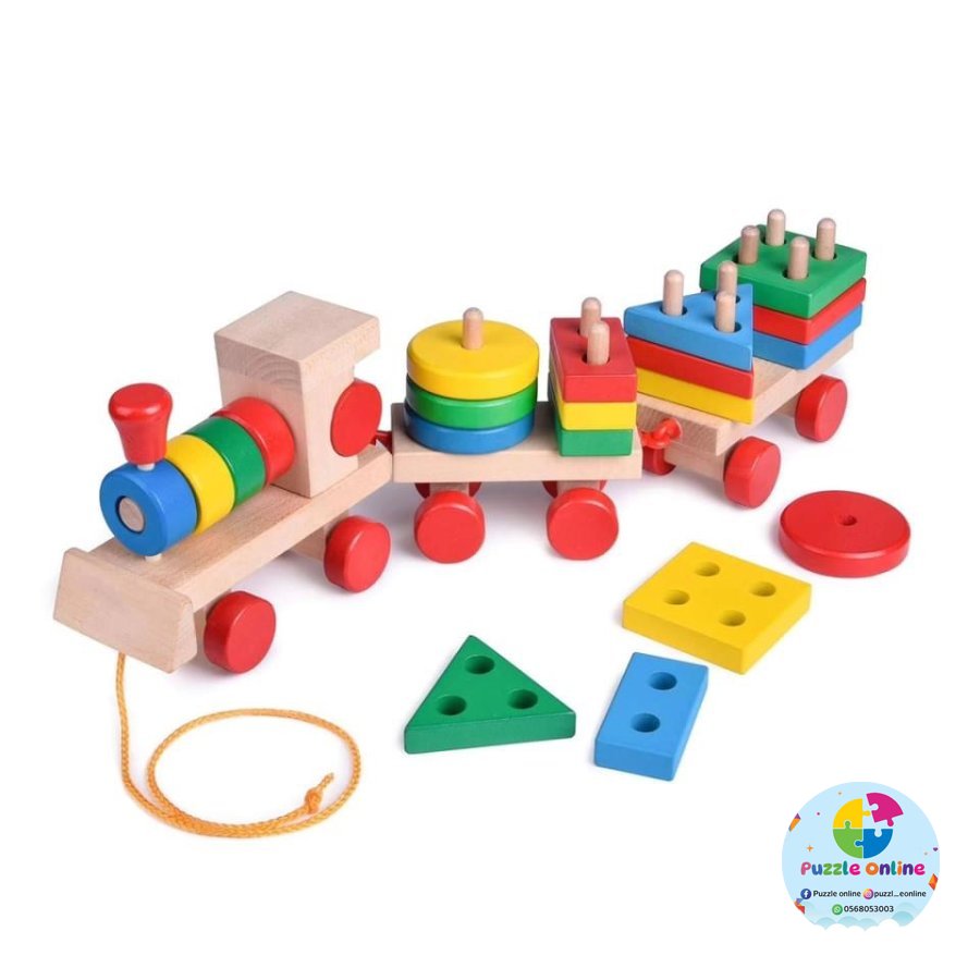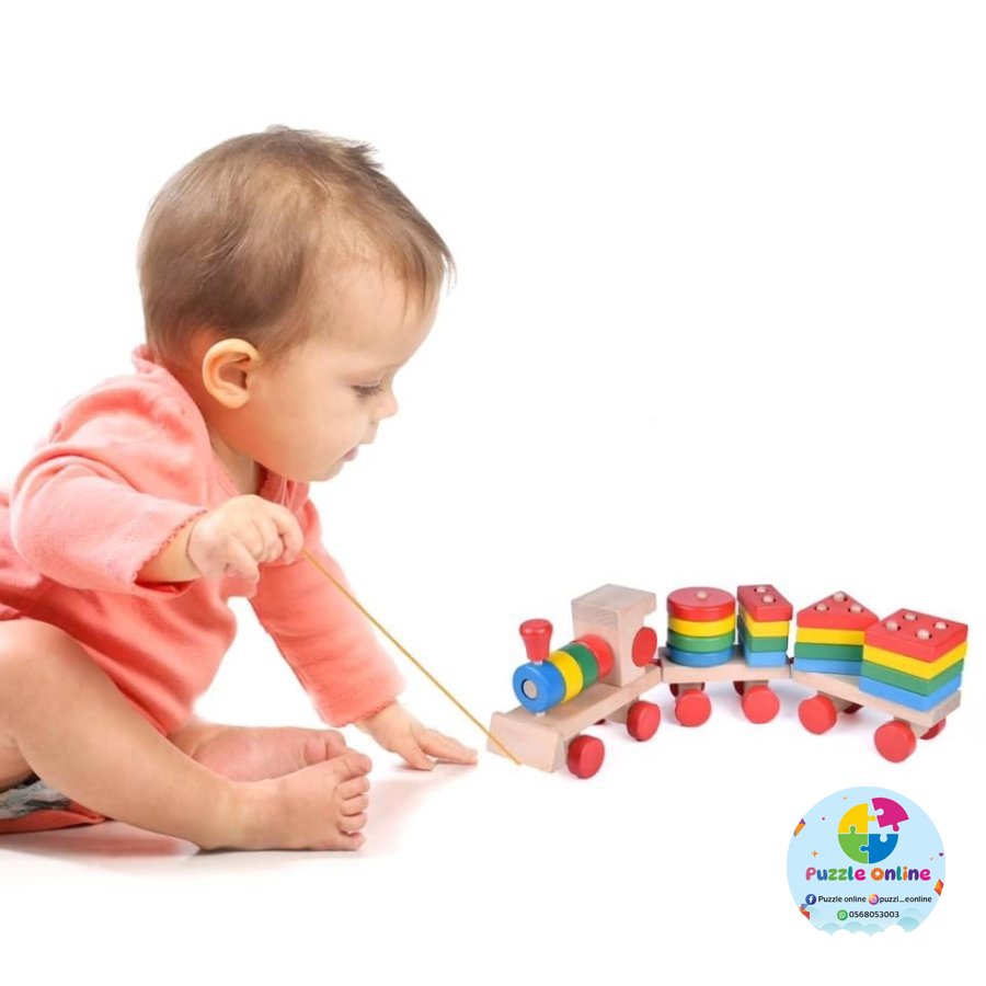 قطار خشبي مكوّن من أشكال هندسية ملوّنة (دوائر 🔴 مربعات 🟦 مثلثات 🔺) بيقدر الطفل يركّبها ويفكّها بحرية.