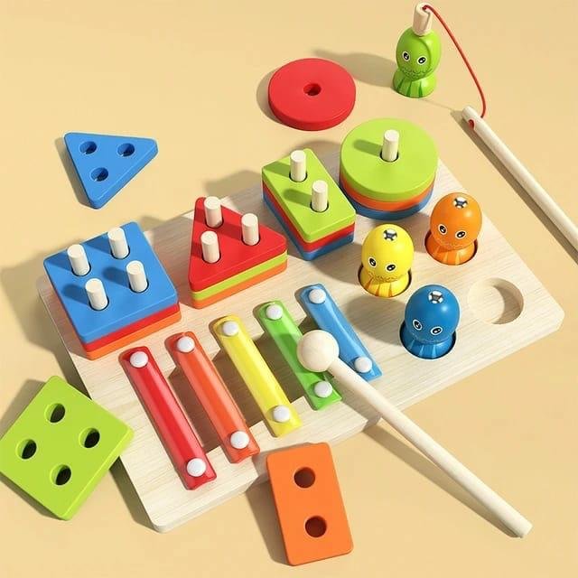 تحتوي على آلة موسيقية ملونة، وأشكال هندسية يمكن ترتيبها حسب اللون والشكل، بالإضافة إلى لعبة صيد الأسماك اللطيفة 🎣.
