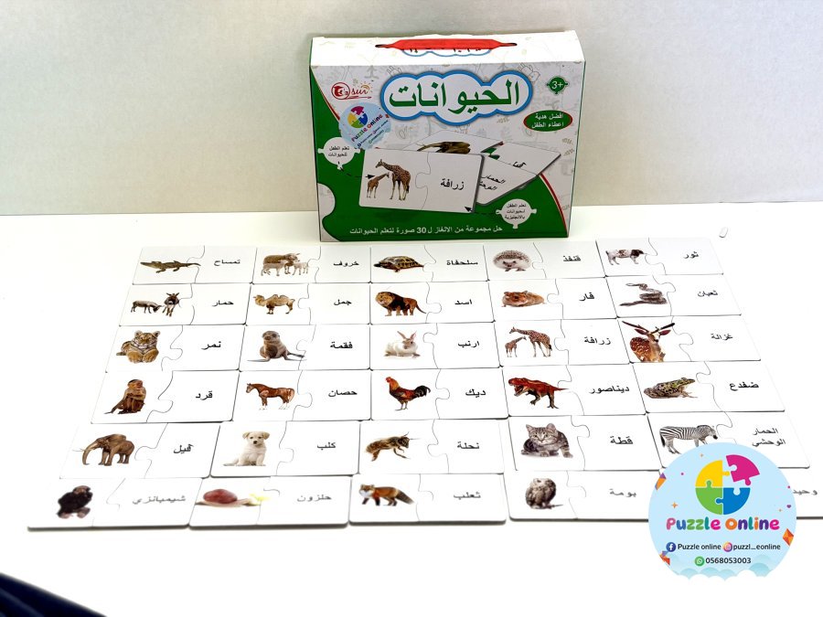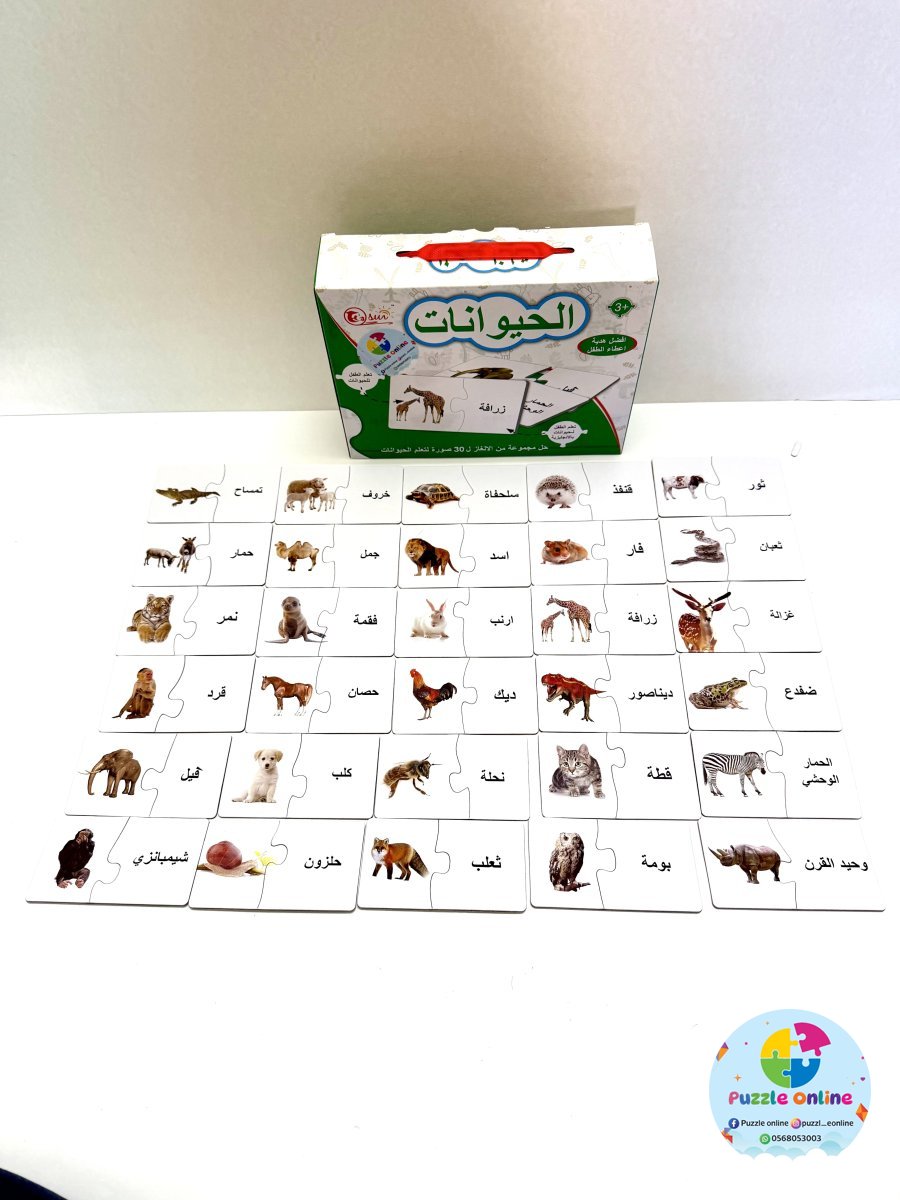 مجموعة بازل تعليمية تحتوي على رسومات واضحة لحيوانات مختلفة، مع كتابة أسمائها باللغة العربية.