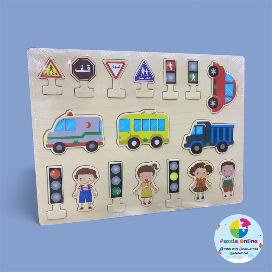 لوحة تطابق الأشكال الخشبية – وسائل المواصلات وإشارات المرور 🚗🚌