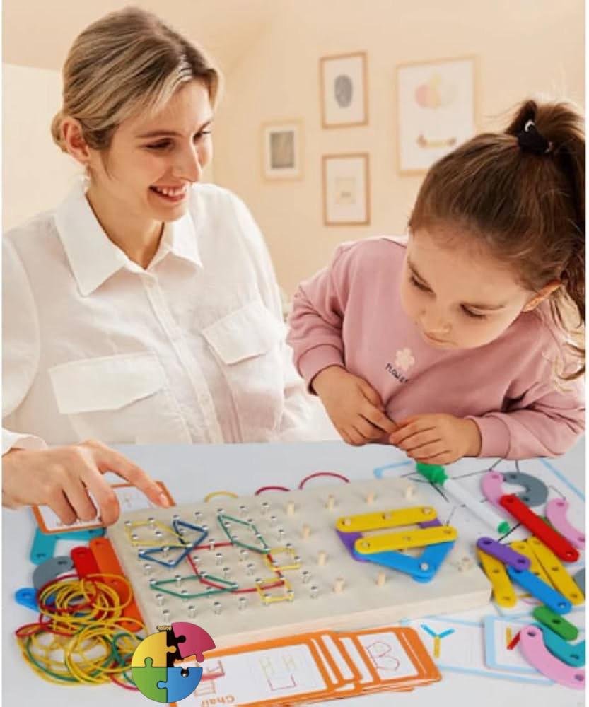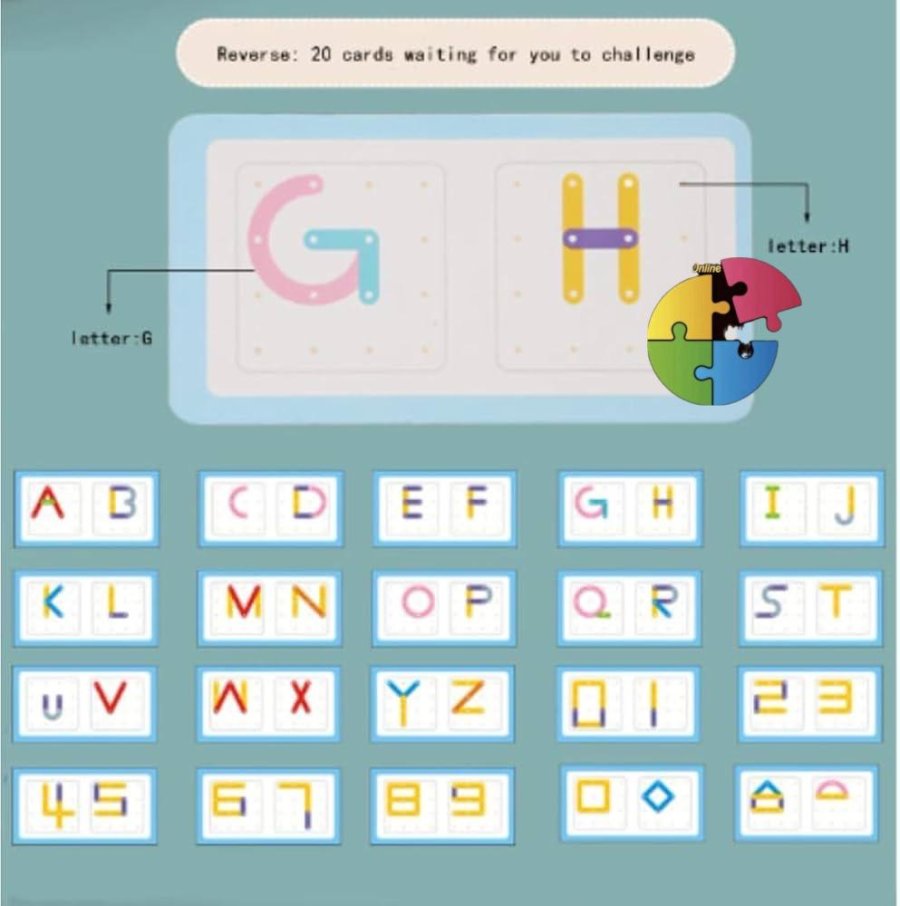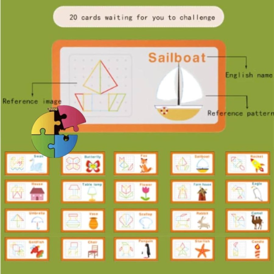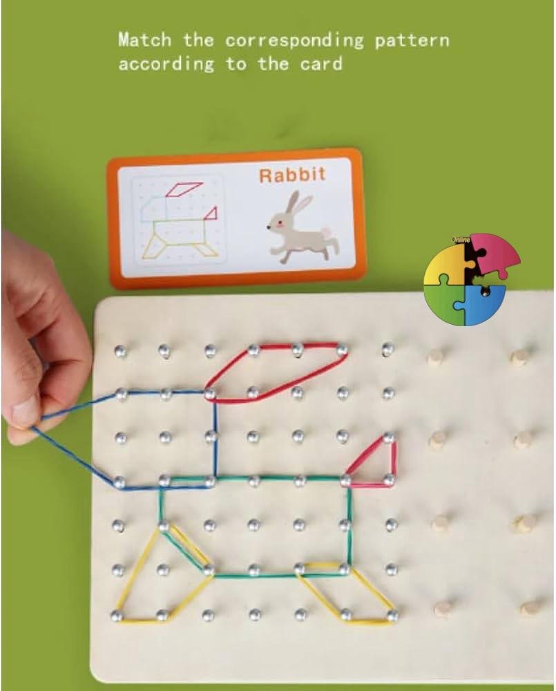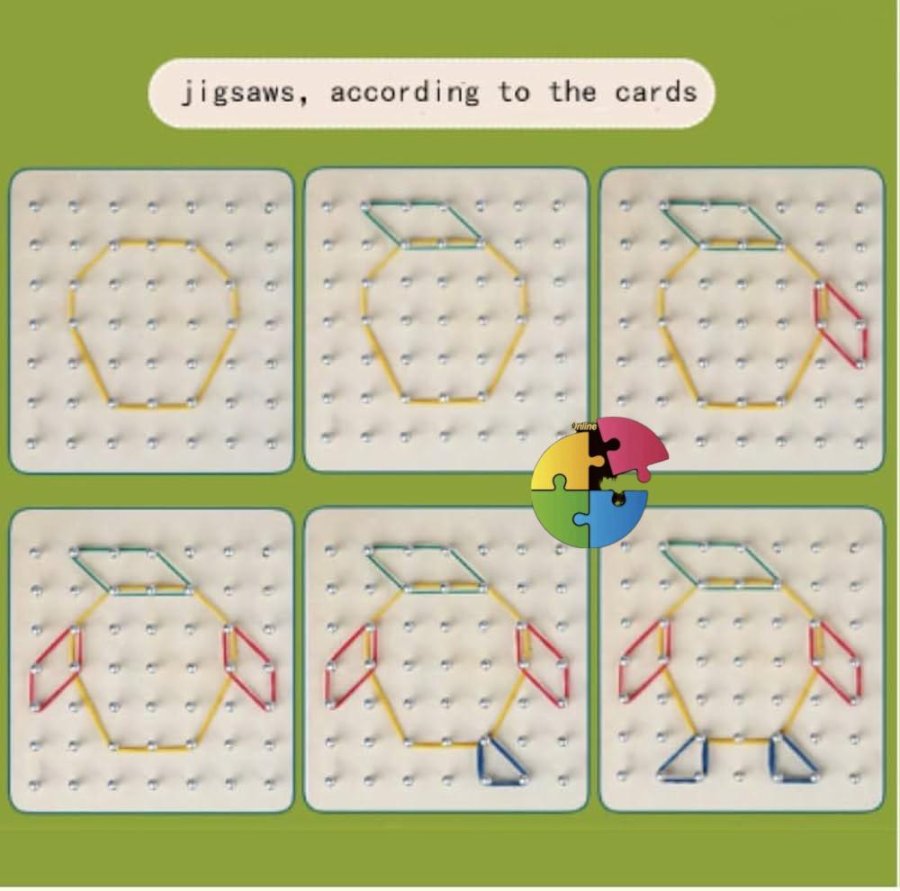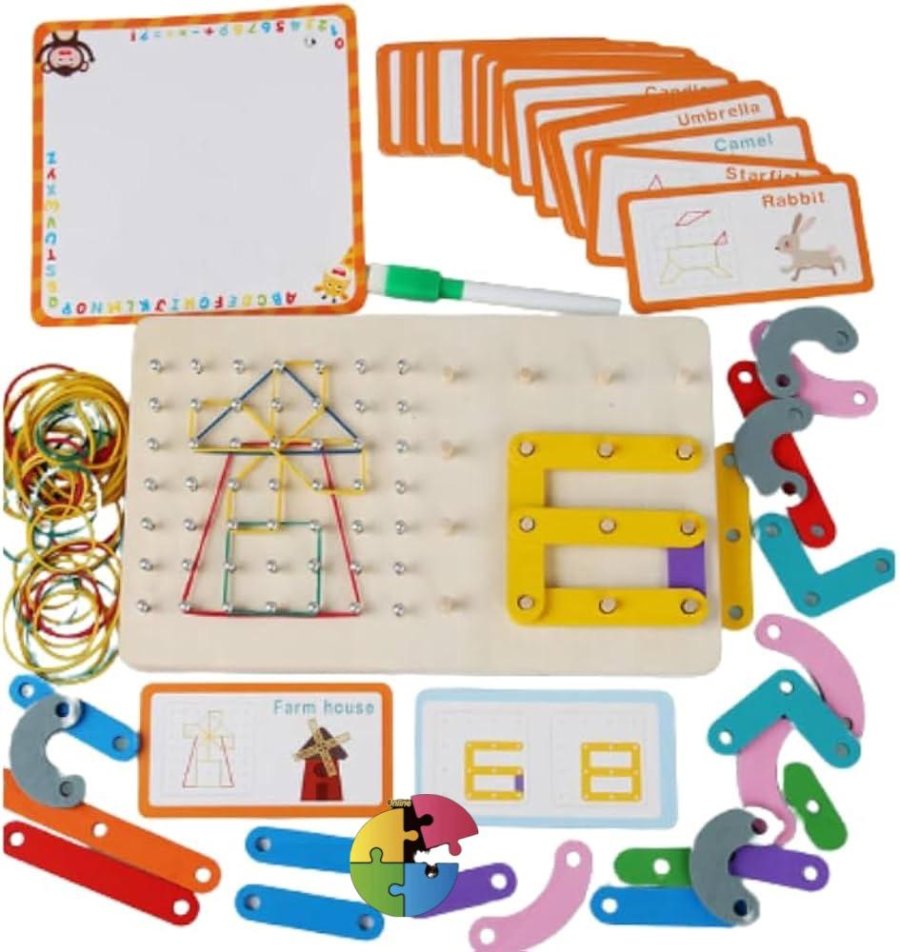🟩 لوح الأوتاد والمطاطات لتشكيل الحروف والأشكال، مثل بيت أو حرف "E"، بأسلوب يحفّز التفكير والإبداع.