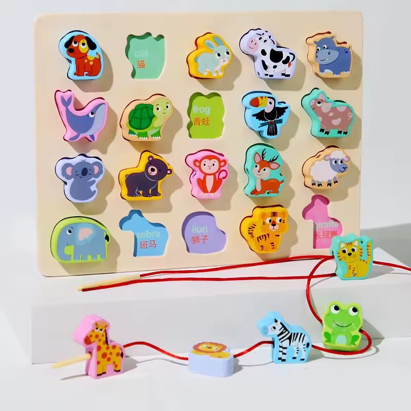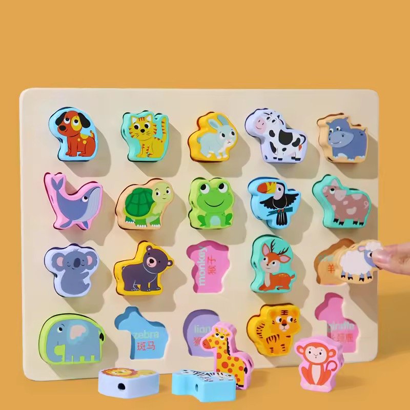 لوحة خشبية ممتعة مليئة بالمجسمات الحيوانية، حيث يمكن لطفلك وضع كل مجسم في مكانه الصحيح لتعزيز مهارات المطابقة والتعرف على الحيوانات 🐶🐸🦓.