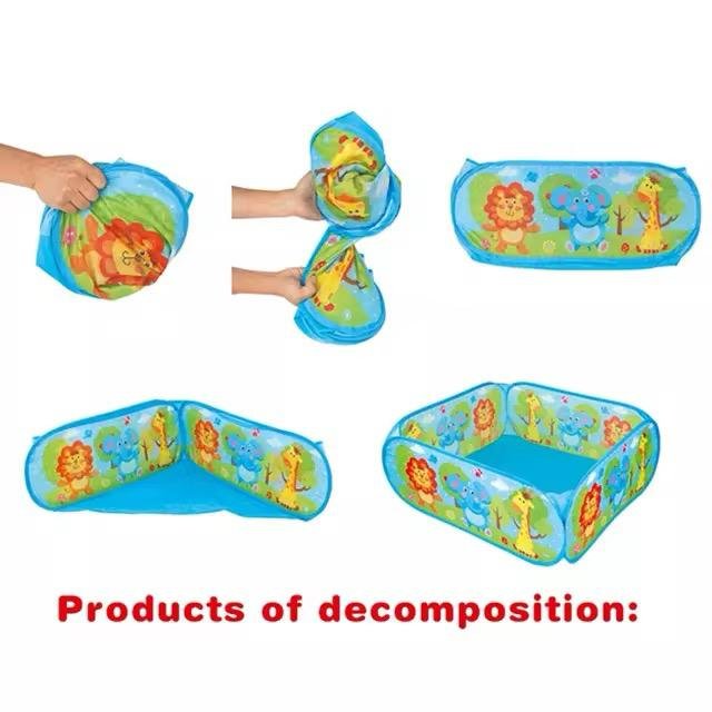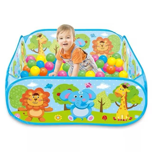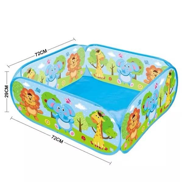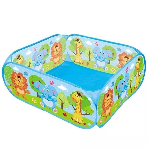 مساحة لعب آمنة ومبهجة مصممة خصيصًا لتحفيز حواس الطفل وتعزيز حركته واستكشافه. يتميز الحوض بجوانب قماشية ناعمة مزينة برسومات كرتونية لحيوانات محببة مثل الأسد، الفيل، والزرافة، ضمن مشهد طبيعي مفعم بالألوان. يحتوي على مجموعة من الكرات البلاستيكية متعددة الألوان، مما يخلق بيئة لعب ديناميكية ومريحة.