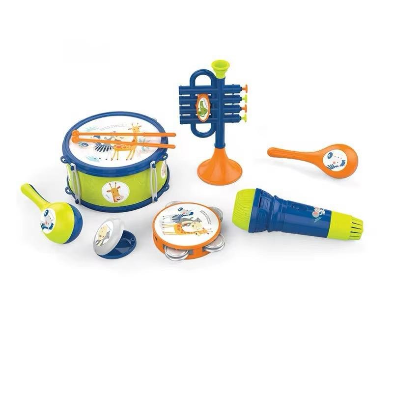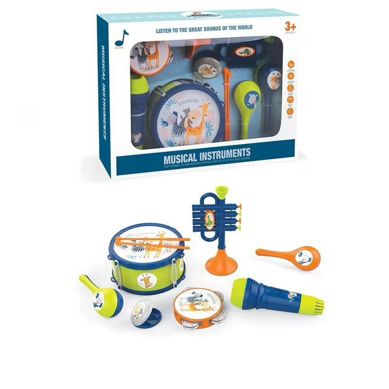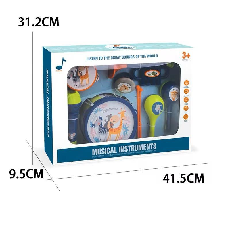 امنحي طفلك فرصة لاكتشاف عالم الأصوات والإيقاع مع هذه المجموعة الموسيقية المصممة خصيصًا للأطفال من عمر 3 سنوات فما فوق. تحتوي المجموعة على طبلة، بوق، دف، ماراكاس، كاستنيت، وميكروفون، كلها بألوان زاهية ورسومات حيوانات مرحة تُشعل الخيال وتُشجّع على اللعب التفاعلي.