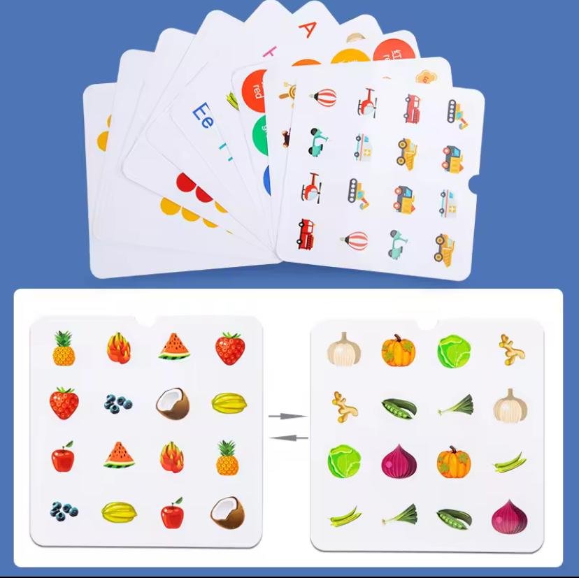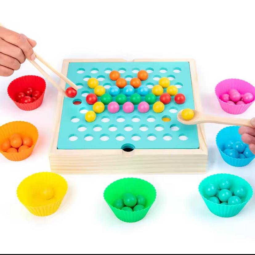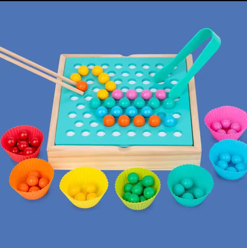 لعبة متعددة الوظائف تجمع بين تحدي الذاكرة والمهارات الحركية. يمكن للأطفال لعب "لعبة الذاكرة" أو استخدام الملاقط لالتقاط الخرزات وتصنيفها حسب اللون.