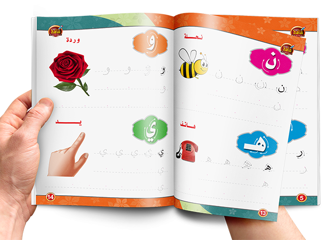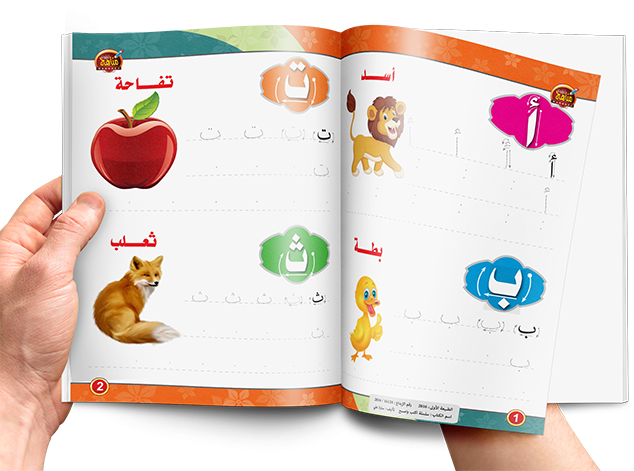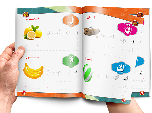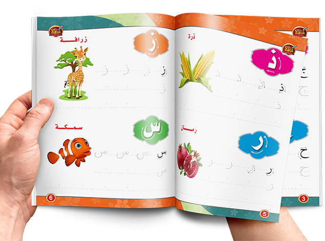 يتعلم الطفل الحروف العربية من خلال الكتابة على الحروف المنطقة وتكرار كتابتها ومسحها عدة مرات وفى نهاية الكتاب سبورة ليكتب فيها الطفل ما تعلمه في الكتاب.