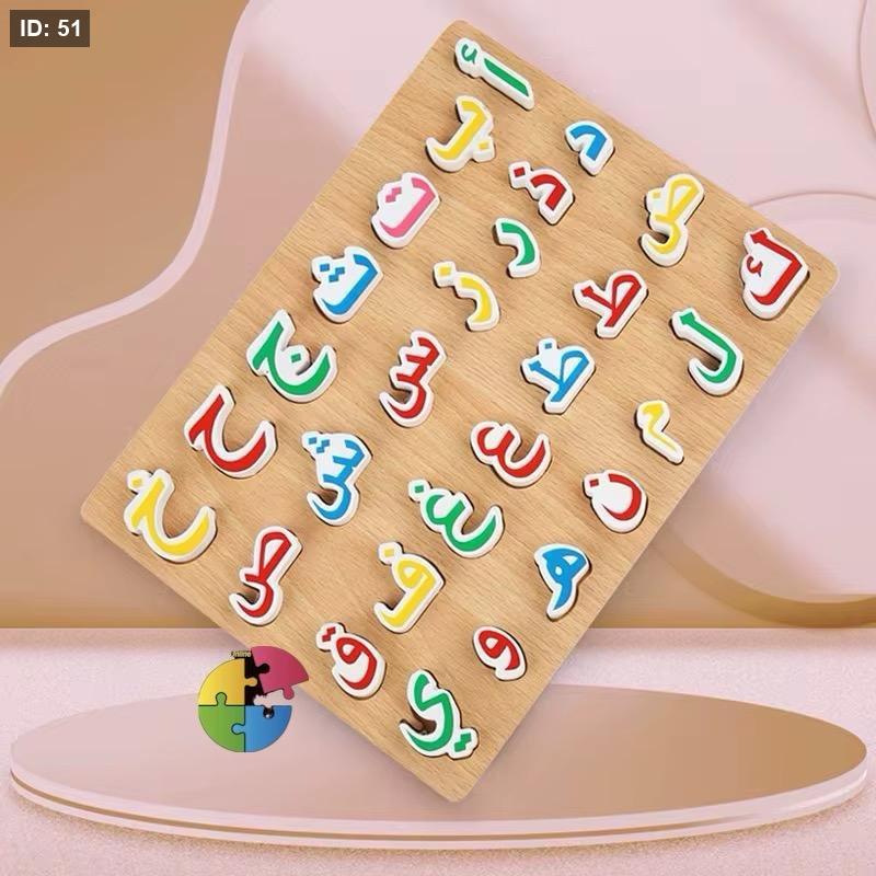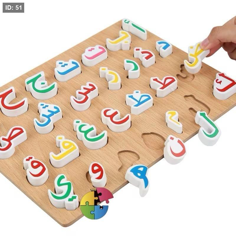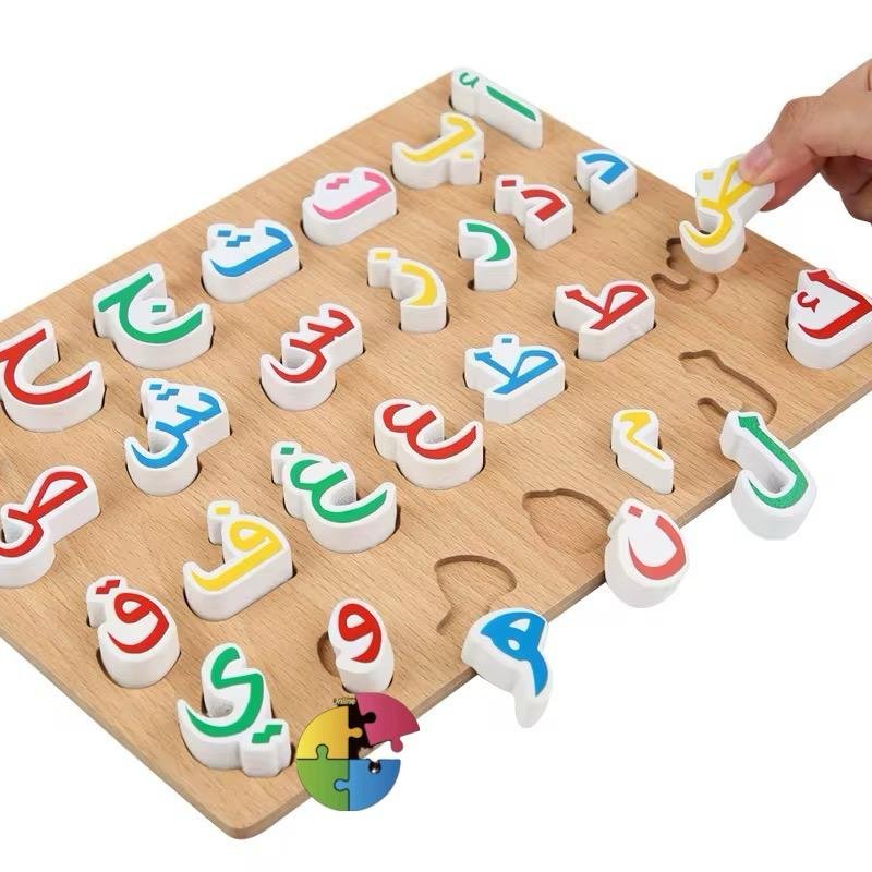 كل حرف مصمم بشكل منفصل ليتناسب مع مكانه على اللوحة، مما يساعد الطفل على التعرف على شكل الحرف وموقعه، ويشجعه على التفاعل الحسي والبصري أثناء التعلم.
