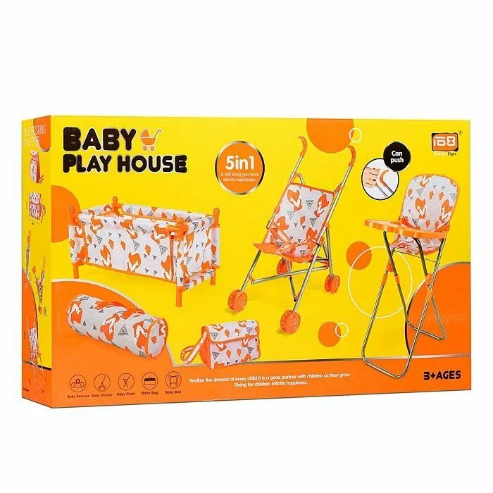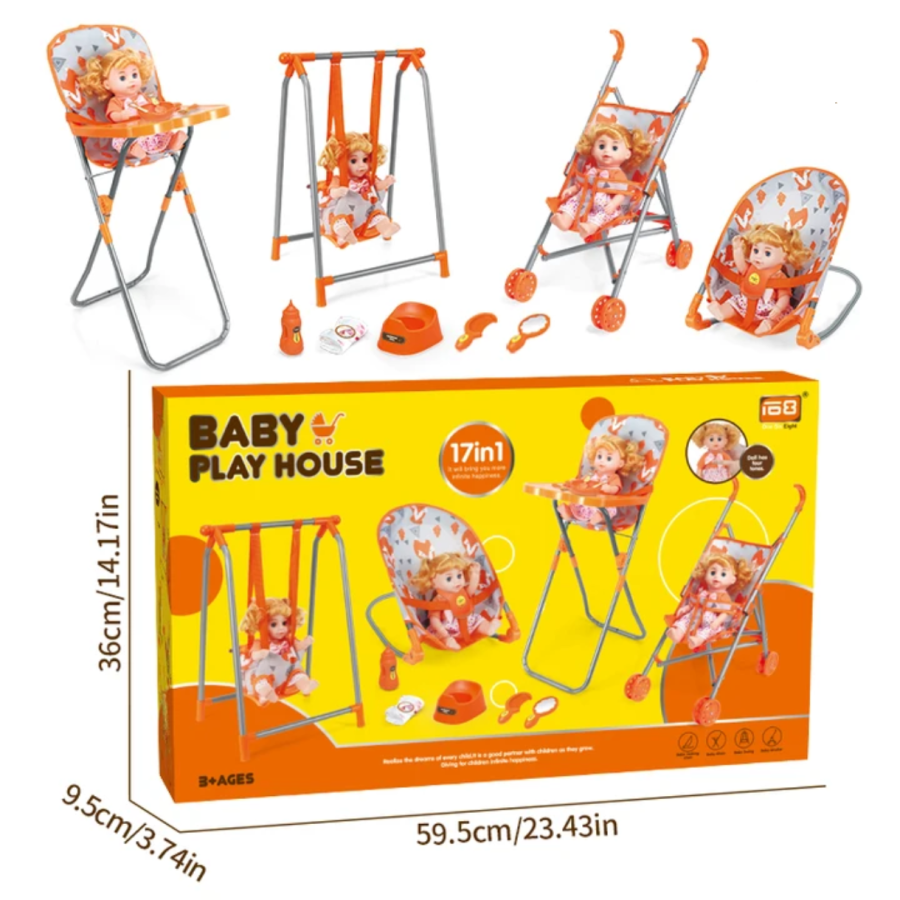 مجموعة متكاملة تضم سرير دمية، عربة، كرسي طعام وإكسسوارات، مصمّمة لتمنح الأطفال تجربة لعب واقعية وممتعة.