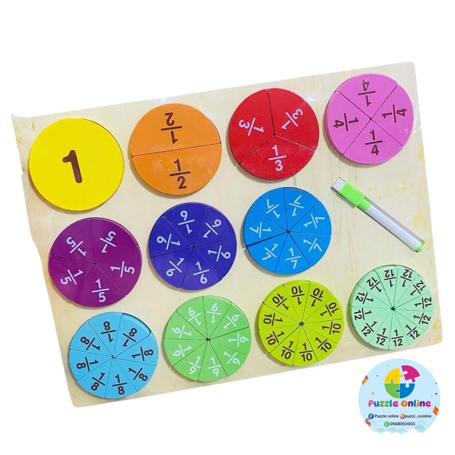 تضم أقراص كسور متعدّدة (½، ⅓، ¼، ⅕… حتى 1/12) بألوان جذابة، مما يساعد الطفل على المقارنة والفهم العملي لمفاهيم الرياضيات بطريقة ممتعة.