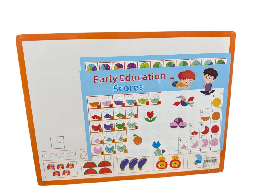 لوحة تعليمية خشبية ملوّنة تساعد الأطفال على فهم الكسور والأجزاء بطريقة سهلة وتفاعلية، مع وجود لوح رسم على الجهة الأخرى يتيح للطفل الرسم والكتابة والتدريب بحرّية.