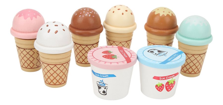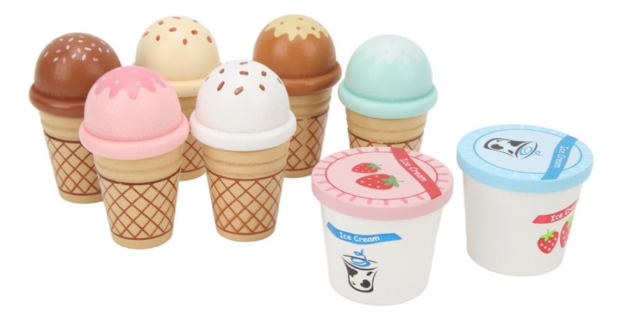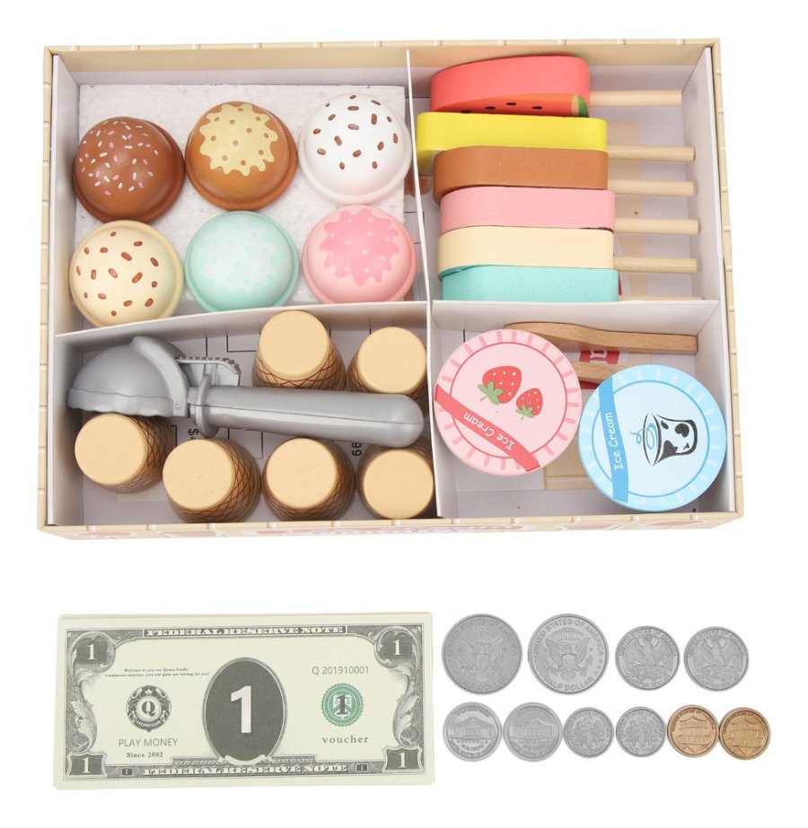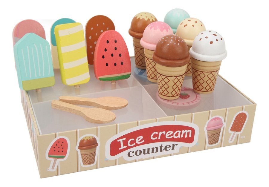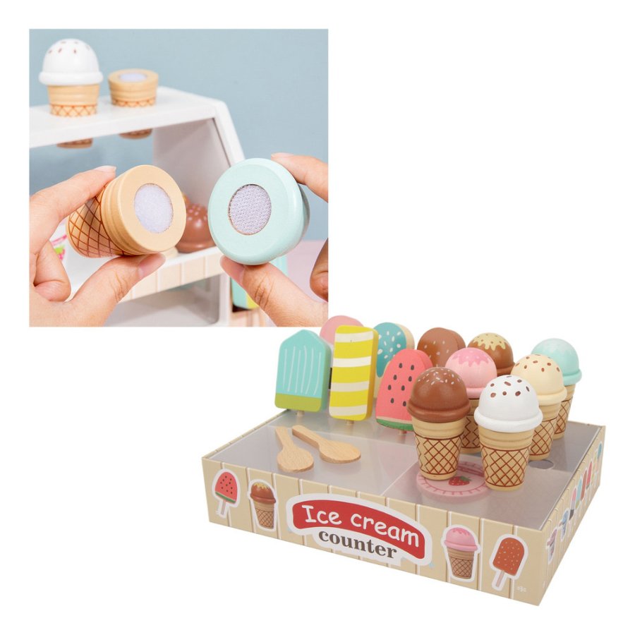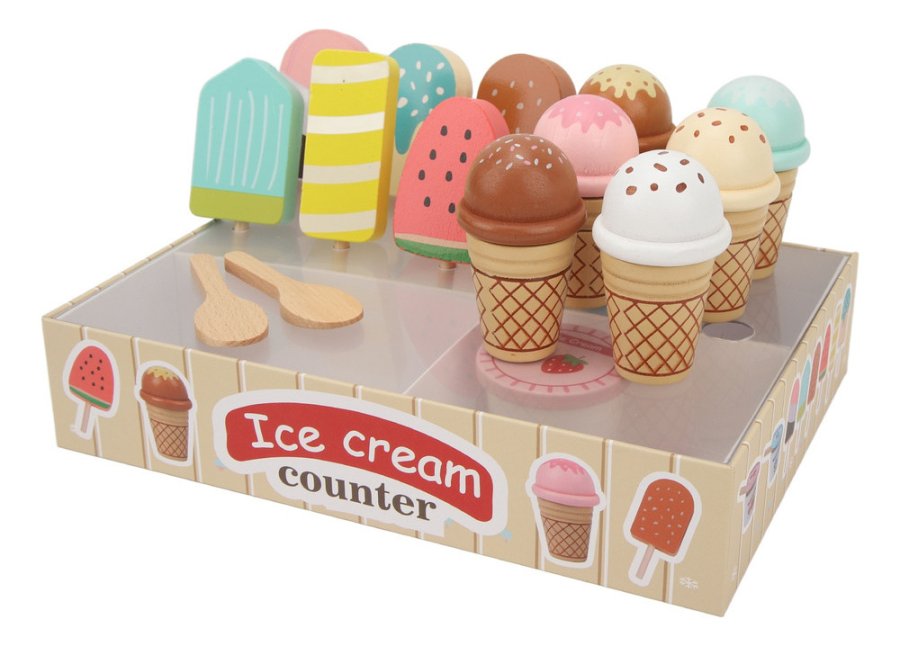 تصميم ملوّن وجذاب يحاكي محل الآيس كريم الحقيقي، مع تشكيلة رائعة من المثلجات والعصي الخشبية التي تمنح طفلك حرية الابتكار وتقمّص الأدوار.